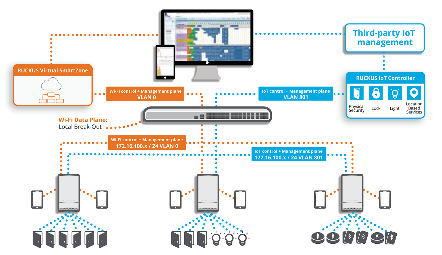A virtual controller, deployed in tandem with a RUCKUS SmartZone OS-based controller, that performs connectivity, device, and security management functions for non-Wi-Fi devices, as well as facilitate disparate endpoint management coordination and APIs for northbound integration with analytics software and IoT cloud services.
